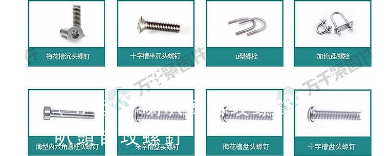 螺栓有:1、方頭螺栓,2、半圓頭方頸螺栓,3、十字槽盤頭螺釘,4、內六角沉頭螺釘,5、方螺母C級,6、蝶形螺母,7、六角頭螺栓,8、十字槽盤頭自攻螺釘。大小有M18、M6、M8、M16、M10、M12、M14、M20等型號。通常用